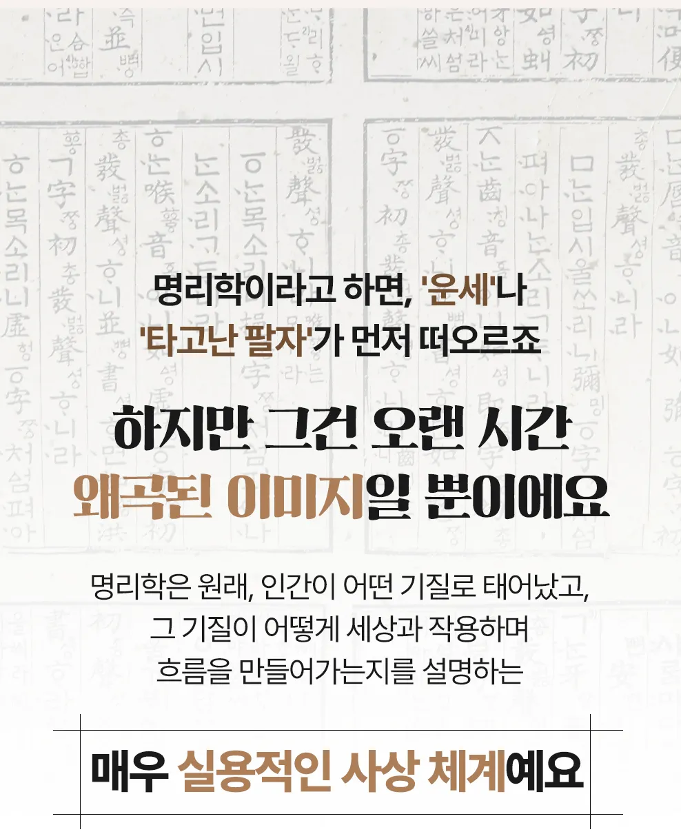 그렇기에 무료 강의를 통해 명확한 공식과 메세지만을 전달 드립니다. 복잡한 이론보다 실용적 지식으로 여러분의 삶에 실질적인 도움이 되는 명리학을 경험하세요.