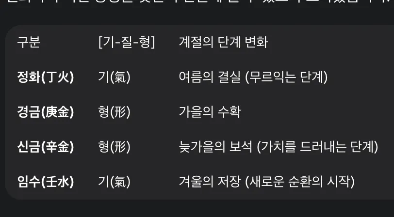 정화는 마치 현미경처럼 복잡한 데이터 속에서 의미 있는 패턴을 찾아내 실질적인 가치를 만들어내는 힘을 상징하죠. 이 뜨거운 열기는 경금(庚金)이라는 단단한 원석을 만납니다. 경금은 불필요한 것을 잘라내고 오직 최고의 결과물만을 추구하는 '구분능력'을 의미하는데, 정화의 열기로 제련되는 과정을 통해 비로소 쓸모 있는 도구나 재료로 거듭나게 됩니다. 정화와 경금은 서로가 서로를 완성시켜주는 최고의 파트너, 즉 희신(喜神) 관계인 셈이죠.